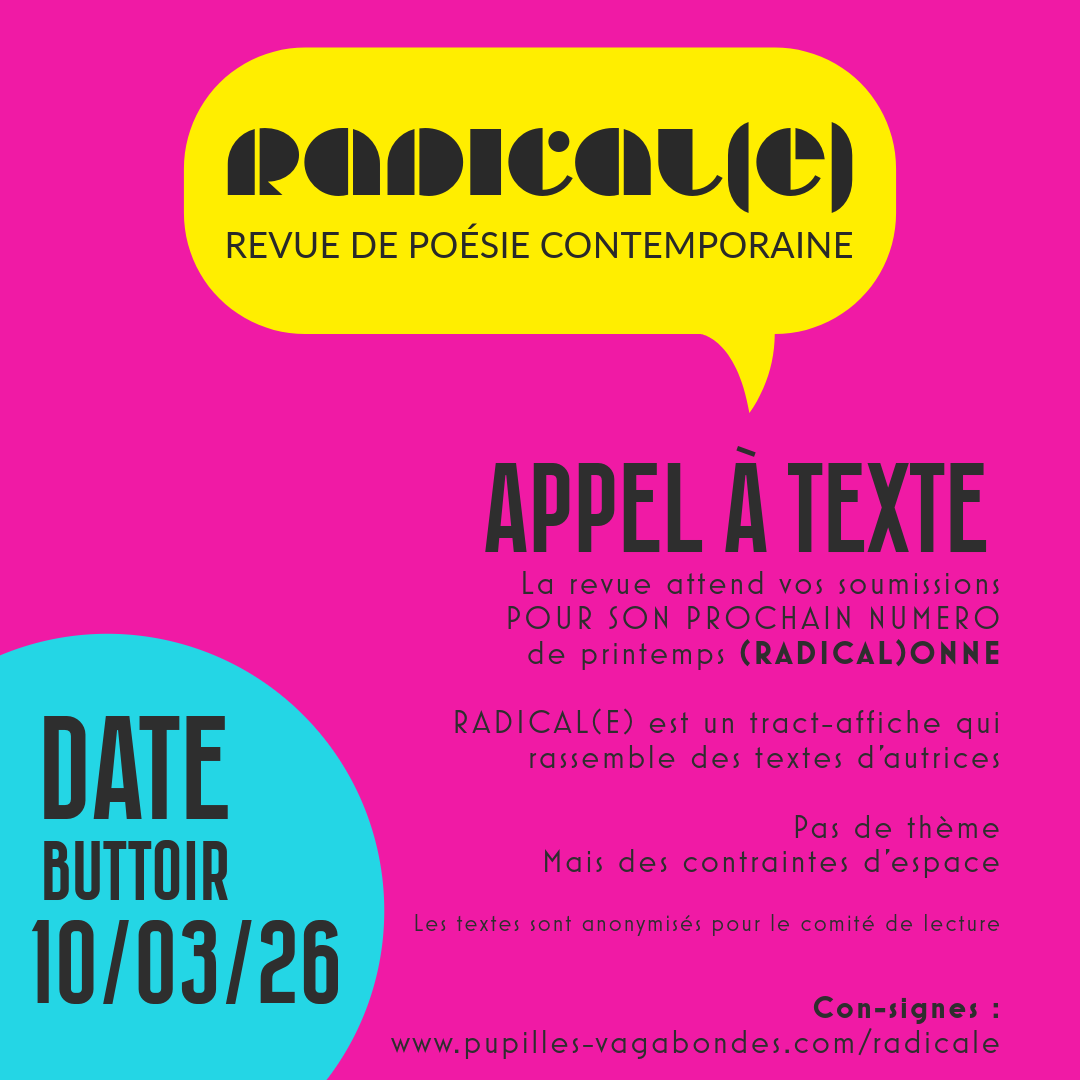 Pupilles Vagabondes s'est associé pour ce premier numéro au collectif ZetMag (Nicolas Vermeulin) et propose (Radical)ée, 1er numéro de la collection RADICAL(E), un tract poétique au format A2 replié, impression offset n&b sur papier 100 gr/m².